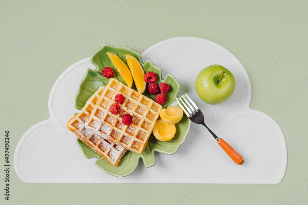 Cute plate in the shape of a tropical leaf with waffles and fruits. Food idea for kids. Children's Breakfast.