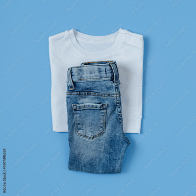 Childrens White T-shirt with jeans. Baby clothes for spring, autumn or summer on blue background. Fashion kids outfit. Flat lay, top view