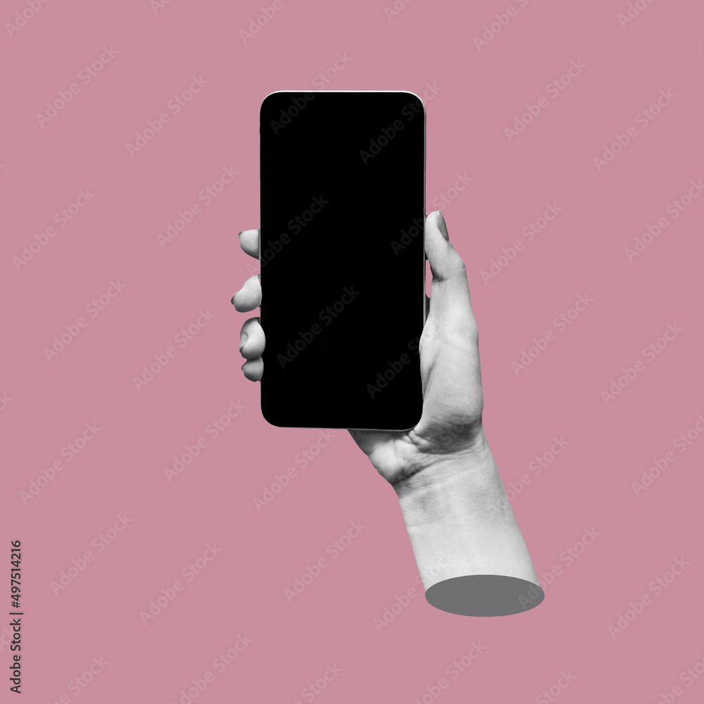 Template for the design. Mobile phone with black screen in female hand isolated on color pink background. Mockup of a smartphone with an empty copy space for the text. Contemporary art. Modern design