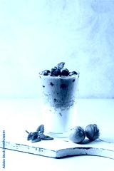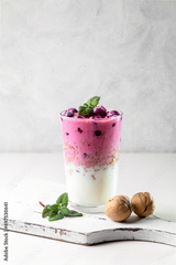 Yogurt, granola with nuts and cherries in a transparent glass. Light and healthy breakfast. Copy space