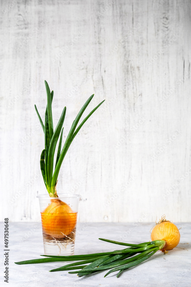 Sprouting fresh green onions. Green onions in a plastic cup with water on a light background. Copy space