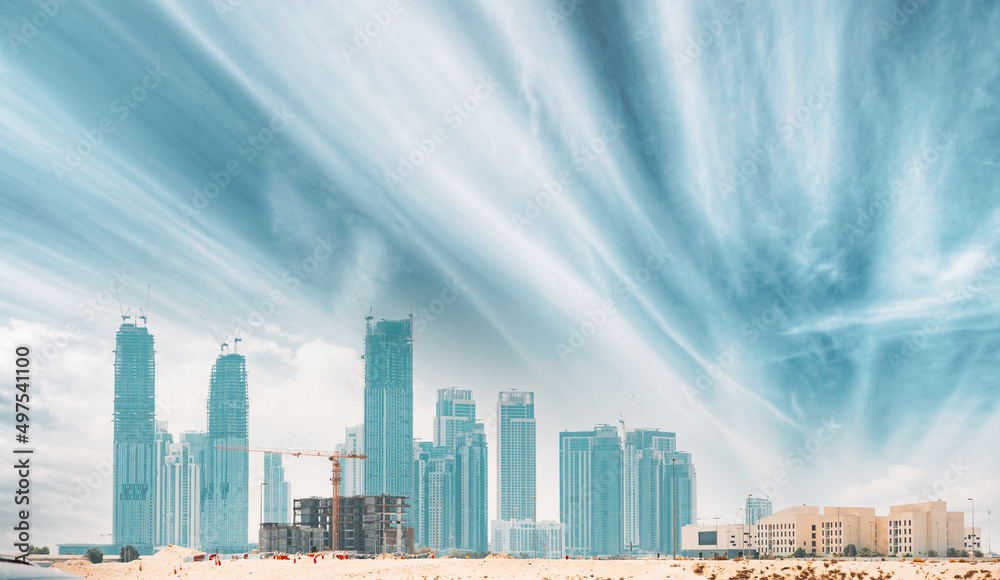 Construction crane is involved in development of new multi-storey residential building. View of modern skyscrapers in Dubai. Construction development of residential houses among modern glass