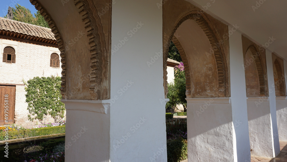 The arched hallway and the garden of Alhambra Palace in Granada, Andalusia, Spain
