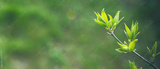 Banner with selective focused tree branch with green leaves on blurred greenery background in garden with copy space. Natural green plants landscape, ecology concept, fresh spring seasonal background