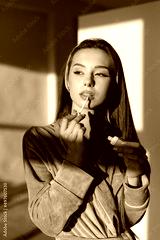 Portrait of brunette woman in rose pajamas applying a lip gloss