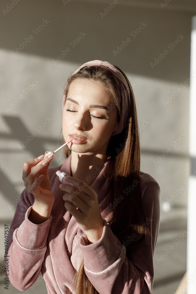 Portrait of brunette woman in rose pajamas applying a lip gloss