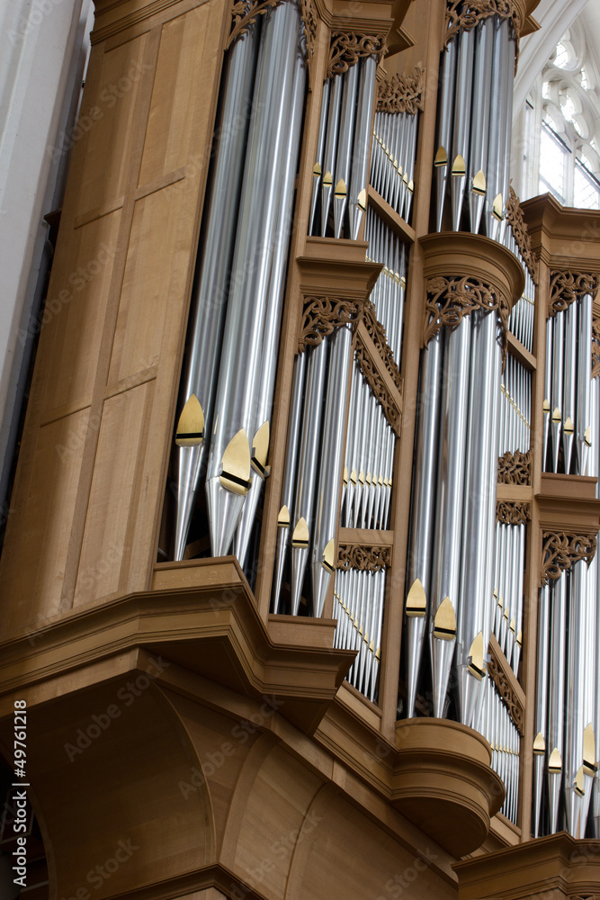 Close-up of a pipe organ in a Cathedral