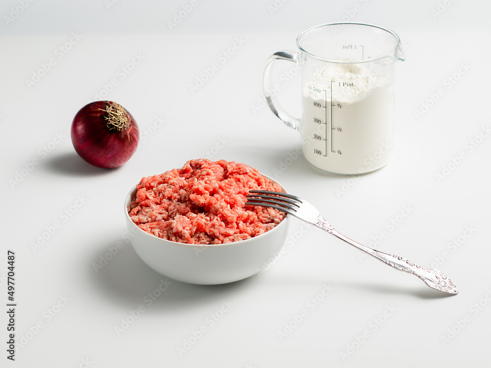 Plate with fresh ground beef and fork, red onion, measuring cup with flour on a white background, stock photo