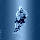 Professional ice hockey player hitting puck for winning goal in action on gradient multicolored neon background. Concept of sport competition.