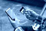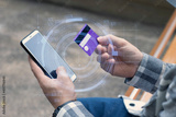 teen boy using smartphone device for online network technology internet; man use mobile in public park, credit card for shopping