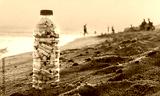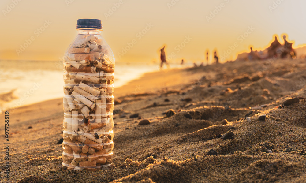 A bottle full of cigarette. Environmental pollution conceptual photo. Allegorical closeup drawing attention bad water environment pollution reasons, no smoking addiction photography. Blank copy space.