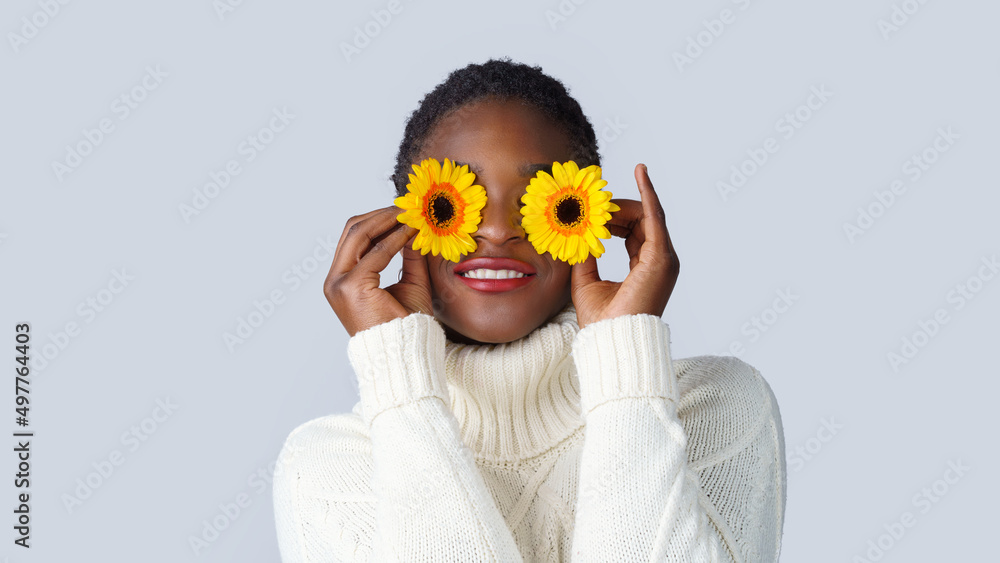 Portrait of a an excited young woman with orange gerbera daisies covering her eyes