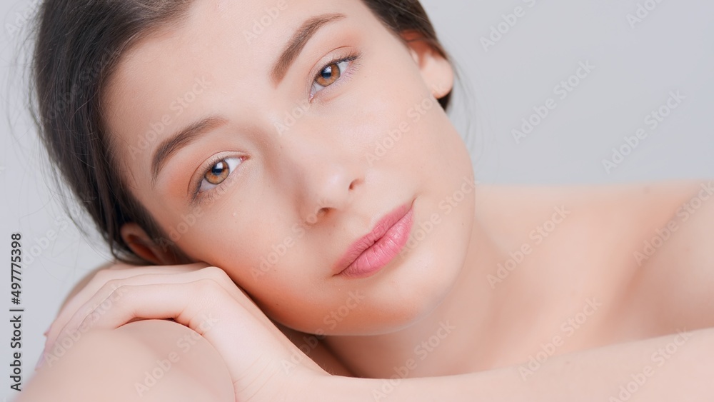 Extreme close-up beauty portrait of young dark-haired woman raises her head, touch her shoulder and looks at camera | Beauty face and skin care product commercial concept.