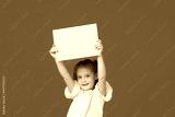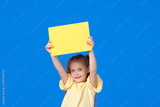 A cute little girl is holding a yellow sign for an inscription on a blue background. Funny face.