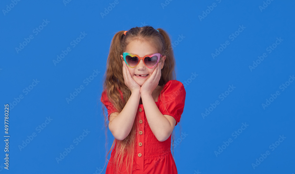 Portrait of surprised cute little toddler girl in the heart shape sunglasses. Child with open mouth having fun isolated over blue background. Looking at camera. Wow funny face