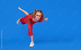 Portrait of surprised cute little toddler girl in the heart shape sunglasses. Child with open mouth having fun isolated over blue background. Looking at camera. Wow funny face