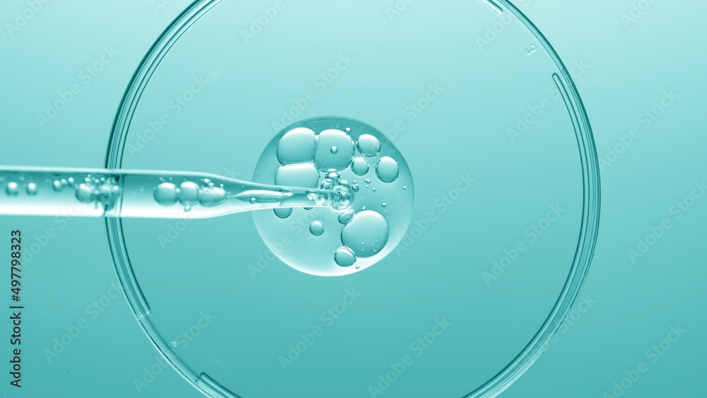 Close up view macro shot of gel with different sized bubbles comes out from lab dropper into petri dish on cyan background | Abstract face care gel with hyaluronic acid mixing concept