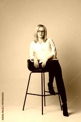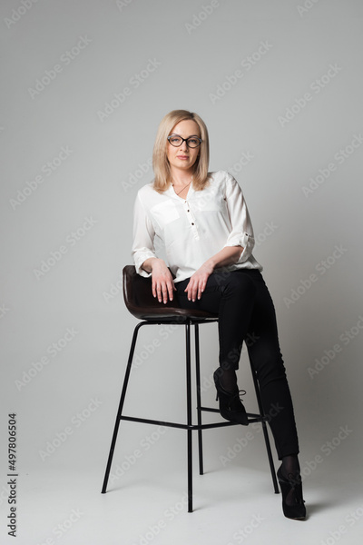 Beautiful young woman with glasses sitting on a chair in a studio with grey background. Sales agent, manager, agent, assistant, teacher, student