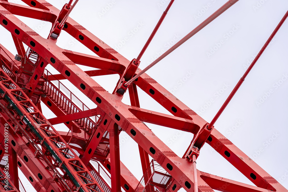 Close-up of fragment of red cable-stayed bridge pylon in place where metal cables are fastened. Close-up shows connection of steel powerful straight crossbar, bridge connection, metal architecture.