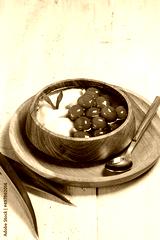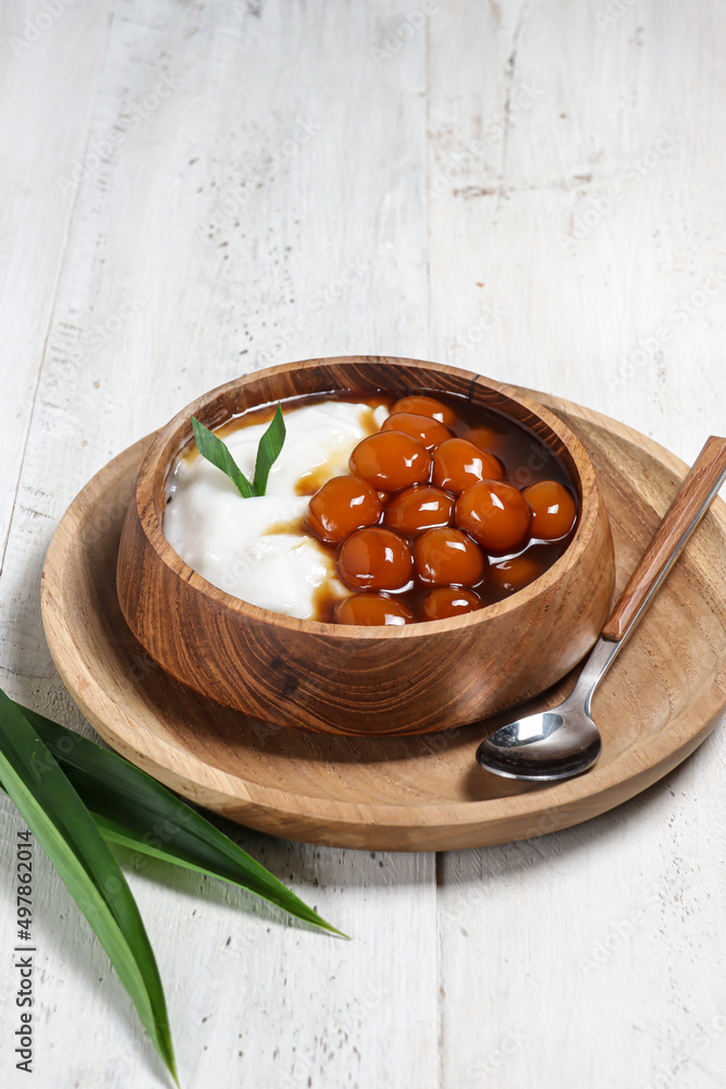 Bubur Sumsum or Bubur Lemu is traditional porridge from West Java, made from rice flour and candil (sticky rice ball), served with palm sugar syrup.