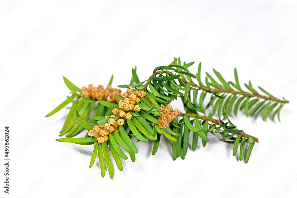 Weibliche Blüten der Eibe vor weißem Hintergrund
