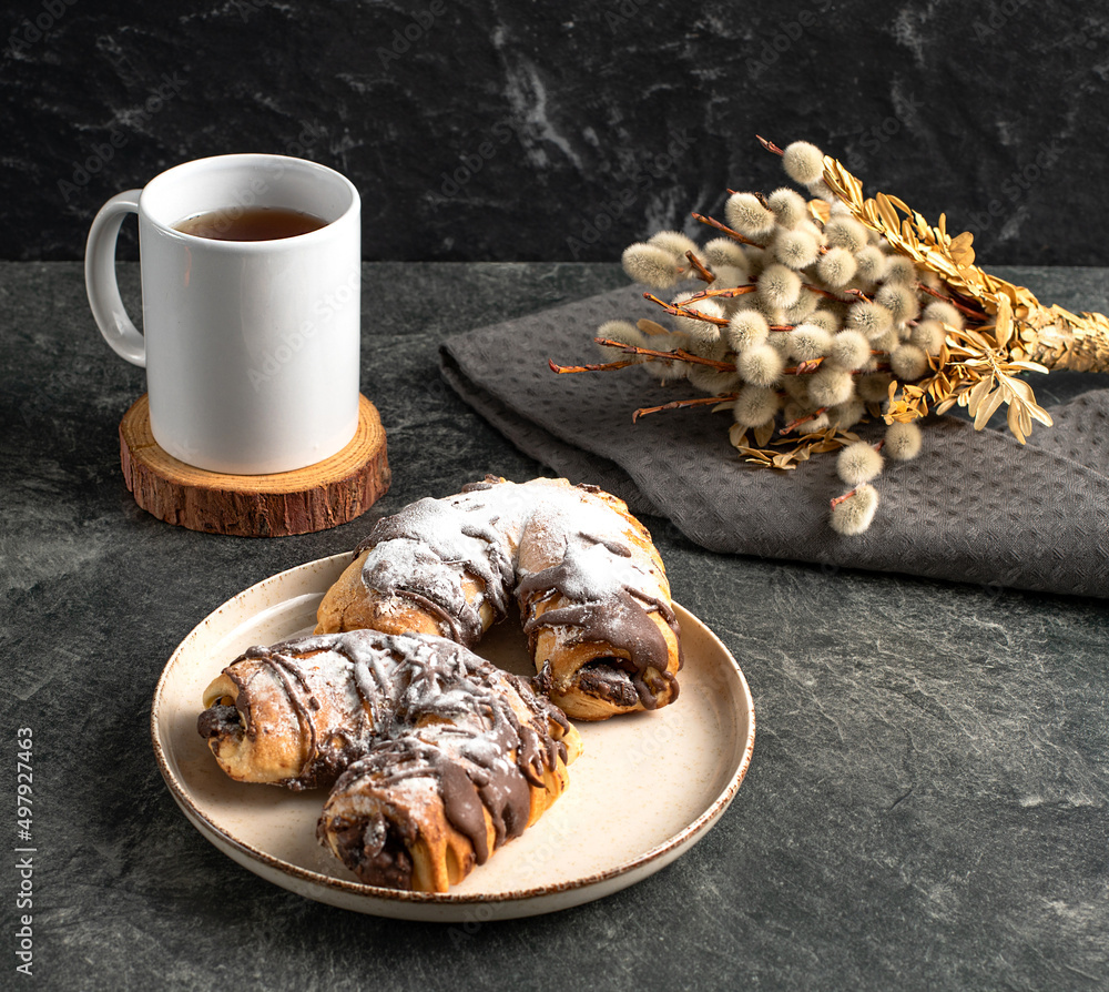 Cup of black tea, traditional chocolate pastries, willow on a dark background, stock photo