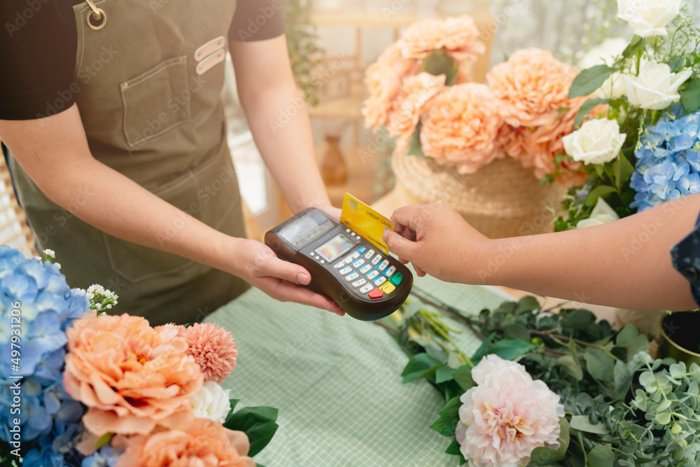 Close up of easy payment by credit card or smartphone application Greenhouse workers selling pottered flowers.Contactless payment with credit card customer at counter using QR code contactless payment