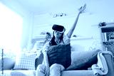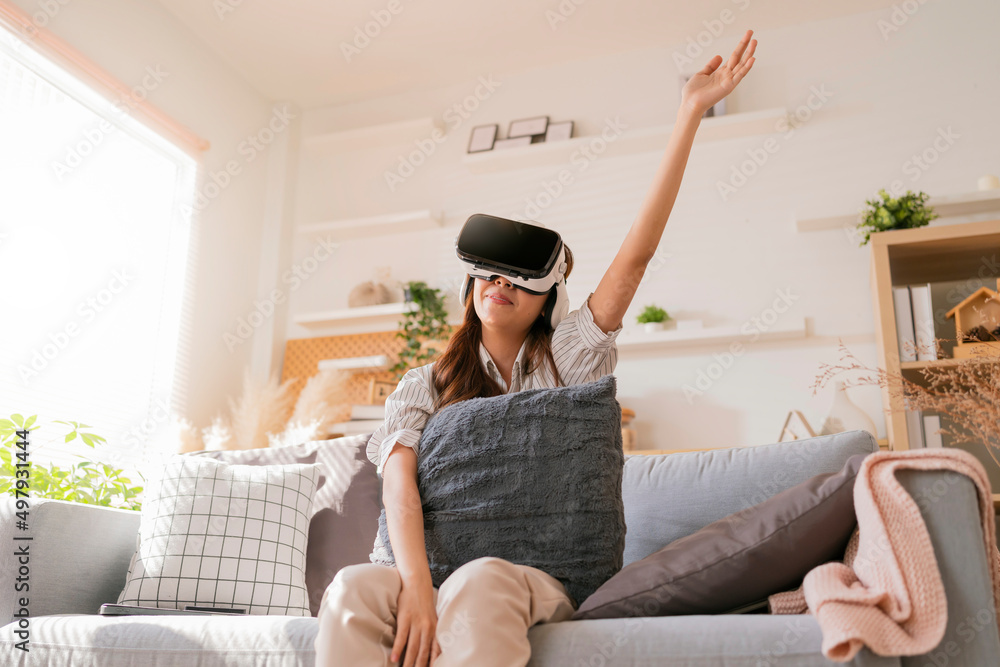 happiness exited asian female teen hand wave along with her virtual concert performance via virtual goggle virtual interactive headset,asia woman stay home innovation technology lifestyle vr at home