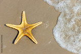 Starfish lying on the sea beach with a waves, top view
