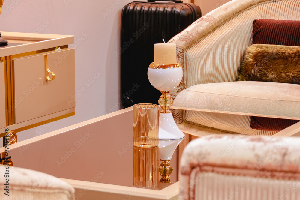 Candlestick on the table in the interior of the room. Room interior in golden style