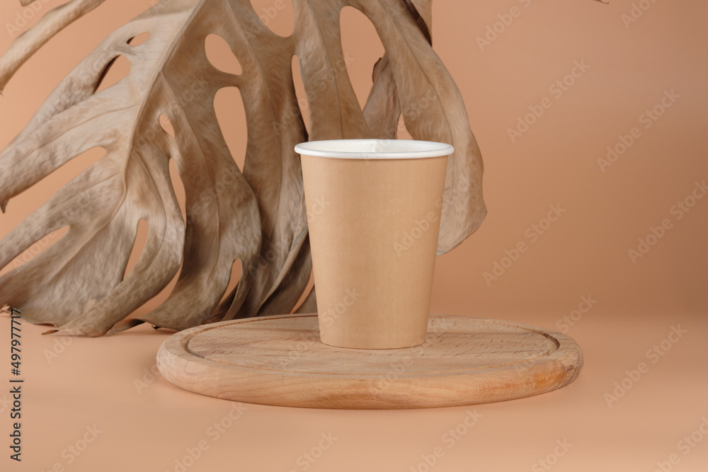 A cardboard cup for hot drinks, tea or coffee on a wooden podium or tray. In the background is a dried monstera leaf. Monochrome image in beige tones.