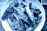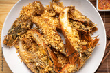 Stir fried flathead lobster with garlic and pepper on wooden table, Fried flathead lobster with garlic.