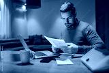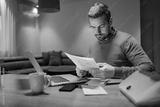 A casual businessman doing paperwork and working from home.