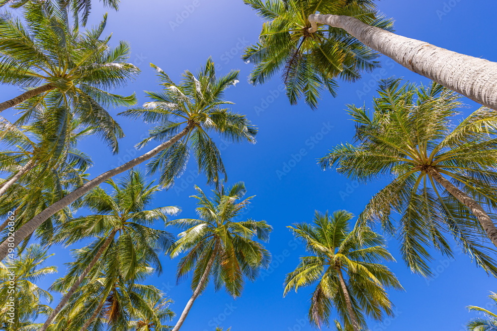 Palm trees with a clear blue sky. Exotic tropical nature pattern, foliage. Green trees under blue sky. Idyllic natural landscape background, beautiful botany ecology concept