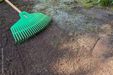 Raking grass seeds in spring in the garden