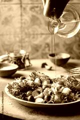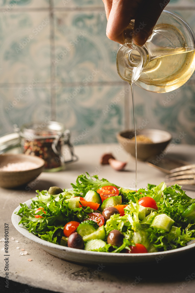 A hand pouring olive oil into classic vegetable salad with fresh olives, tomatoes and cucumbers on gray background.