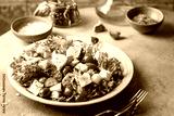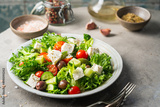 Classic vegetable salad with fresh olives, tomatoes, cucumbers, greek cheese feta and olive oil on gray background.