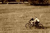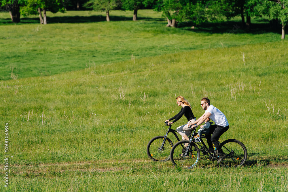 Long shot of a couple traveling on bikes in the countryside. Side view.