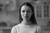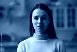 Positive serious millennial model girl home female head shot portrait. Beautiful young adult Caucasian woman looking at camera, posing in apartment. Front profile picture