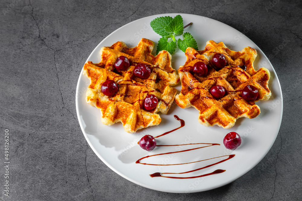 Belgian or Brussels waffles with frozen cherries. Homemade cottage cheese banana waffle in a plate on a dark table. Copy space