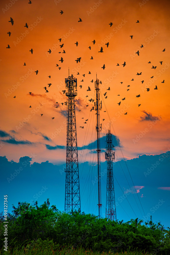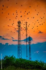 Silhouette telecommunications antenna for mobile phone at sunset