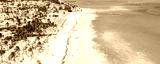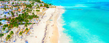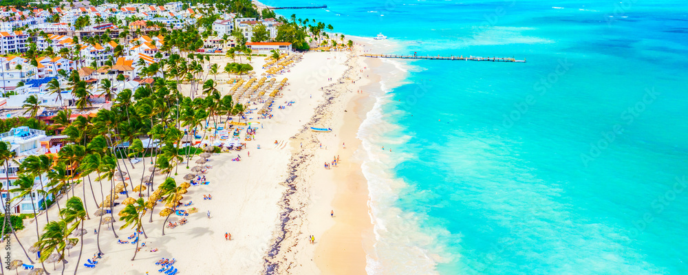 Beach vacation and travel background. Aerial drone view of beautiful atlantic tropical beach with straw umbrellas, palms and boats. Bavaro beach, Punta Cana, Dominican Republic.
