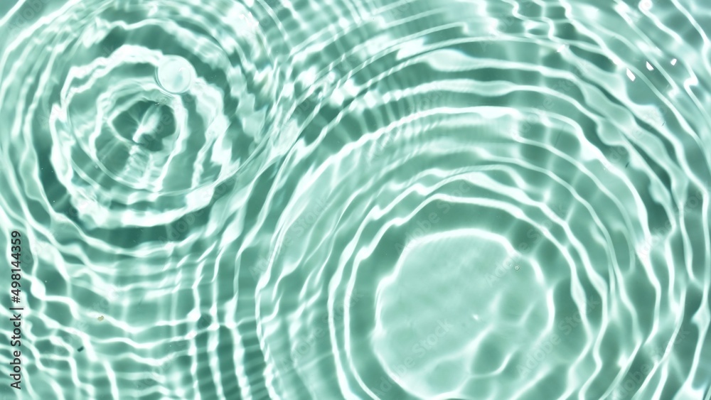 Multiple water drops falling on water surface making multiple water circles against green mint background | beauty product background, water-based skincare concept