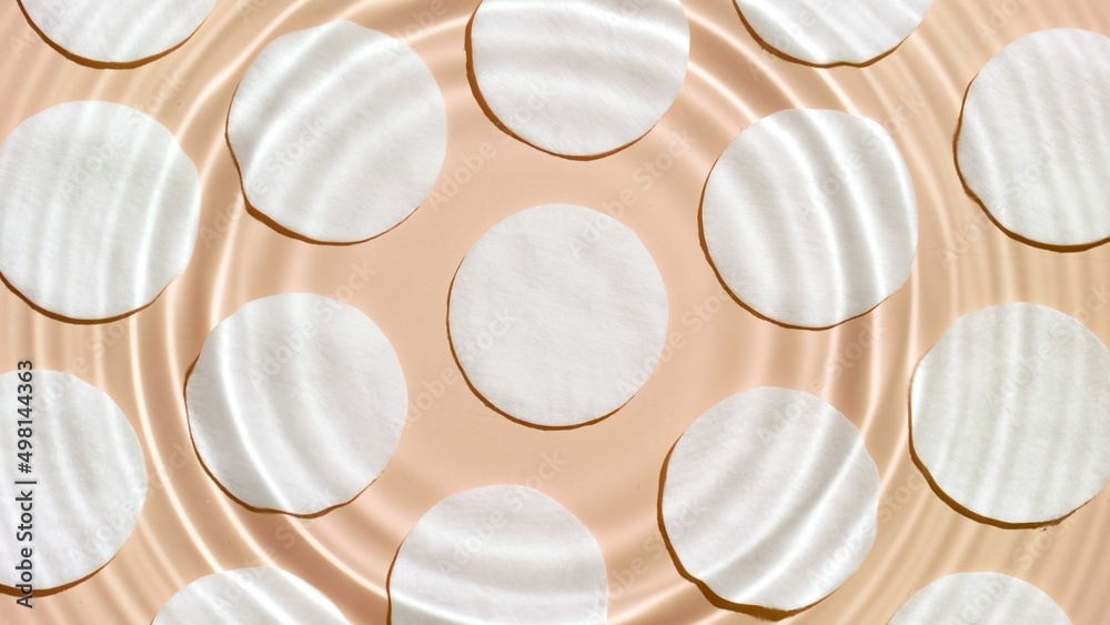 Water drop making water ripples on water surface over cotton pads arranged in rows on beige background | skincare background, cleansing lotion commercial