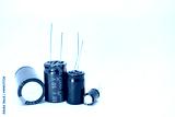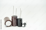 Group of capacitors different sizes isolated on white background. electrolytic capacitors