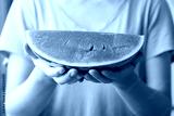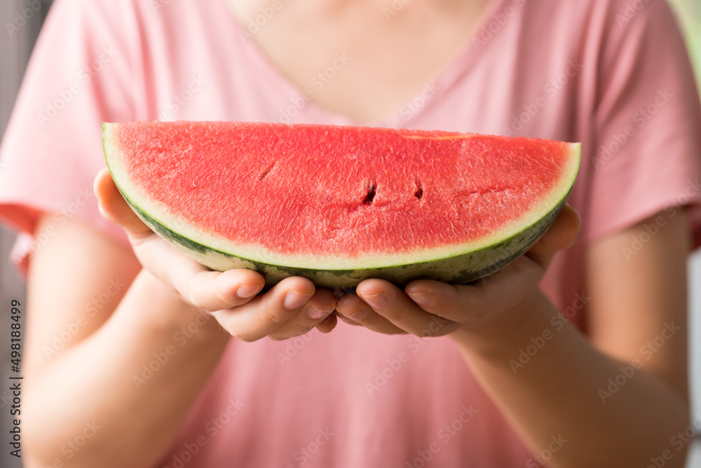 Sliced watermelon holding by womand hand, Tropical fruit in summer season