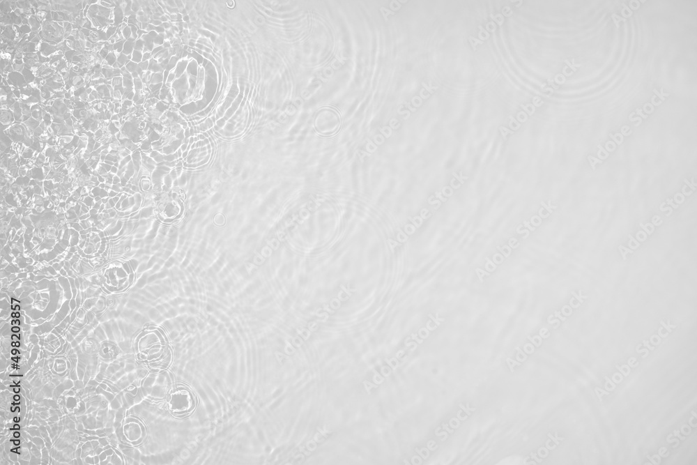 Desaturated transparent clear water surface texture with ripples, splashes Abstract nature background. White-grey water waves overlay Copy space, top view. Cosmetic moisturizer micellar toner emulsion