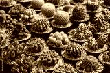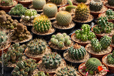 Collection of Cactus in pots for sale . Different Succulent Spine Cactus. Decorative Houseplant Concept.