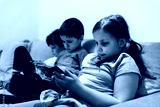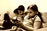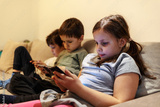 A small group of children spend time looking at phones while sitting on the couch at home. People, children, technology, friends and friendship concept.