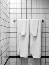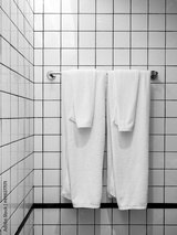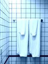 Two clean white towels folded hanging on a metal hanger bar white grid pattern tiles wall at the corner of bathroom background, minimal style, vertical.